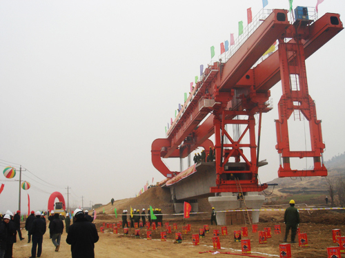 以及生產更新運架產品能架設跨度40M高速鐵路箱梁的:SXJ1000T/40M一跨式架橋機(配套攀爬式運梁車可以實現過隧道零距離架梁)和攀爬式運梁車。并能對現有32M分體式運架設備進行改造,改造后能實現高低位架設跨度40M高速鐵路箱梁(高位改造不能過隧道,把原架橋機改造一跨式,把原運梁車增加2軸。低位改造能過隧道架梁,把原架橋機改造一跨式低位,把原運梁車改成攀爬式運梁車并增加二臺喂梁臺車實現過隧道架梁)。